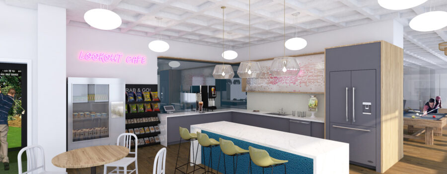 The first of these improvements, the new 3,000 SF 12th floor tenant lounge in the south tower, was designed by DBI Architects and will be fully opened for tenant use in the coming weeks. The new panoramic space features reclaimed wood floors, glass partitions, coffee bar and café, kitchen, game room, and lounge. The project salvaged and reused elements of the bank headquarters it replaces, including fireplaces and crown molding.